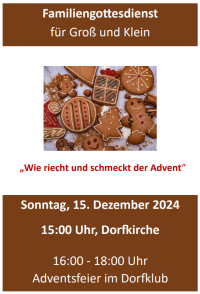 Um 16:00 Uhr ist die ganze Gemeinde zum Kaffeetrinken, Erzählen, Singen und Basteln in den Dorfklub eingeladen. Für Kaffee, Tee, Stolle und Lebkuchen ist gesorgt. Gern kann die Kaffeetafel durch selbstgebackenen Kuchen und Plätzchen bereichert werden.